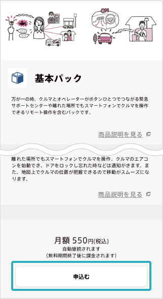 基本パックの詳細をご確認いただき、ページ下の「申込む」をタップ。