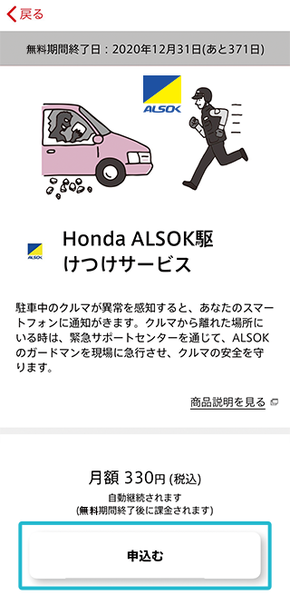 Honda ALSOK駆けつけサービス詳細ページ下の「申込む」をタップ。