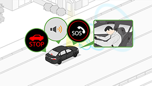走行中にドライバーの体調急変などを検知すると、クルマが周囲に注意喚起し安全を確保しながら停止、自動で緊急サポートセンターに通報します。