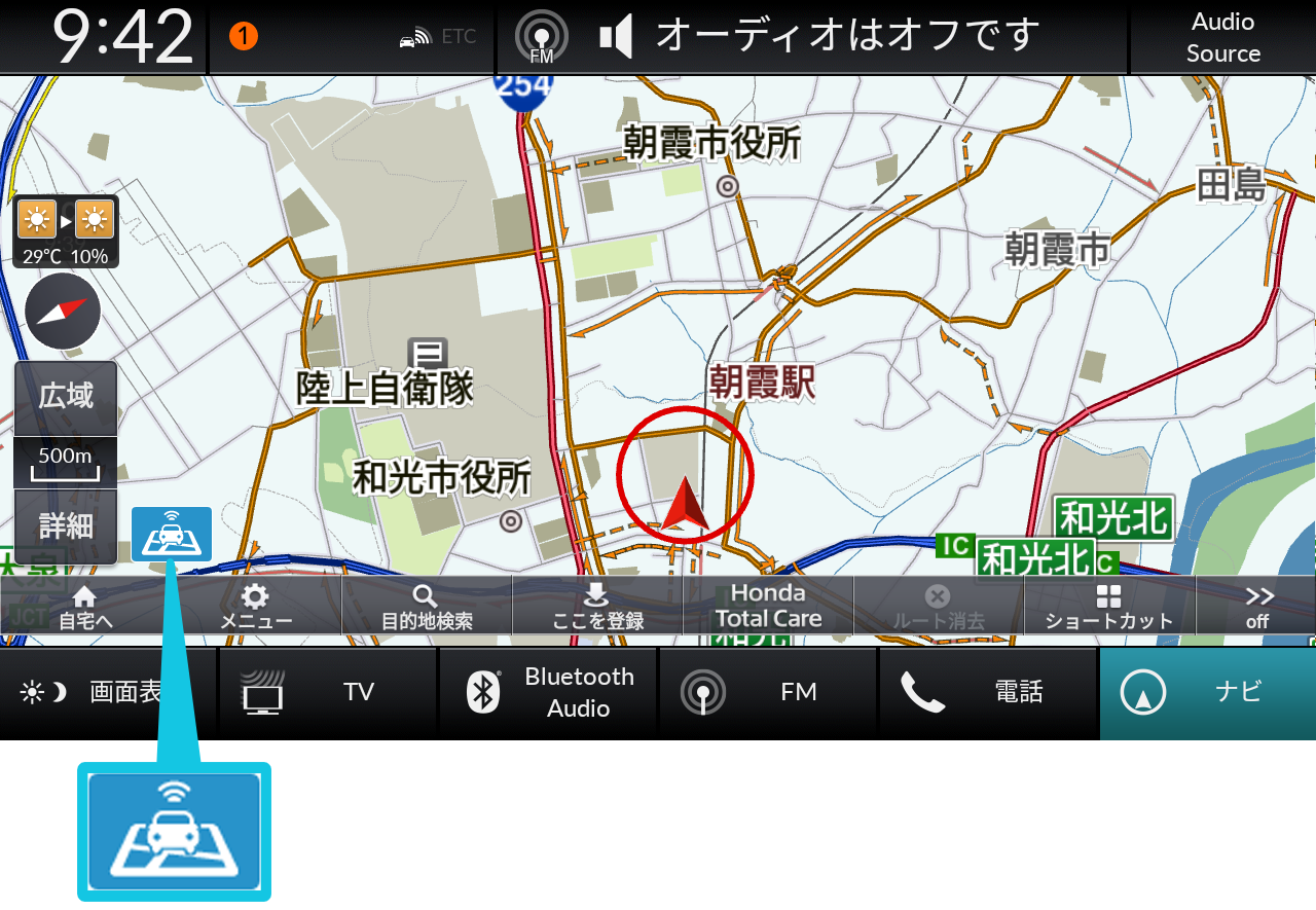 サービス申込後、パワーモードをONにすると自車位置周辺の地図を取得します。