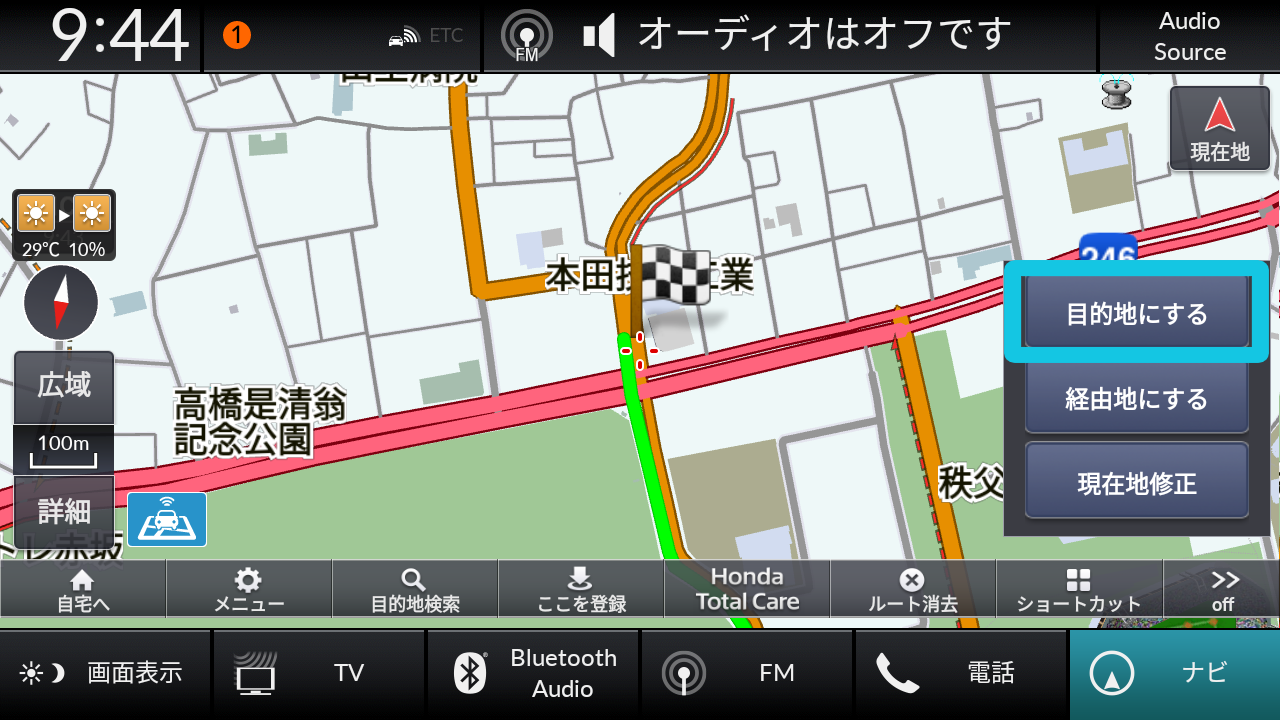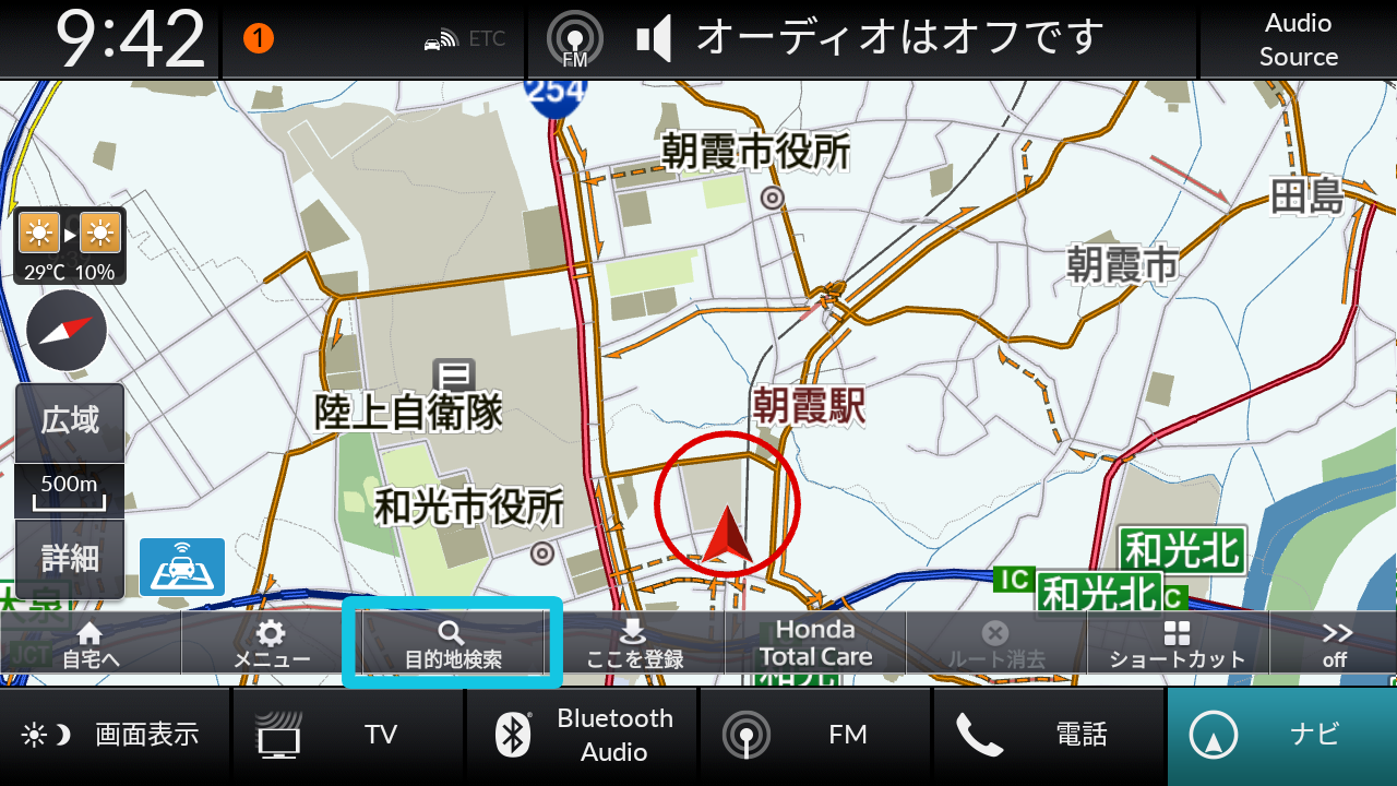 「目的地にする」をタップすると、目的地設定され、目的地周辺の地図を自動取得し、表示します。