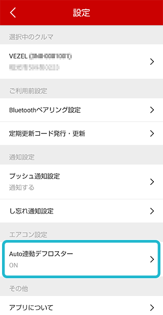 Auto連動デフロスターのON/OFFを変更できます。TOP画面右上「設定」をタップ。