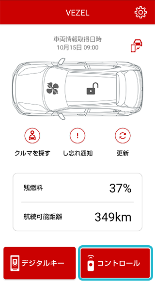 Honda リモート操作アプリを起動し、TOP画面から「コントロール」をタップ。