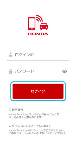 Honda Total CareのログインID&関連アプリパスワードでログイン。