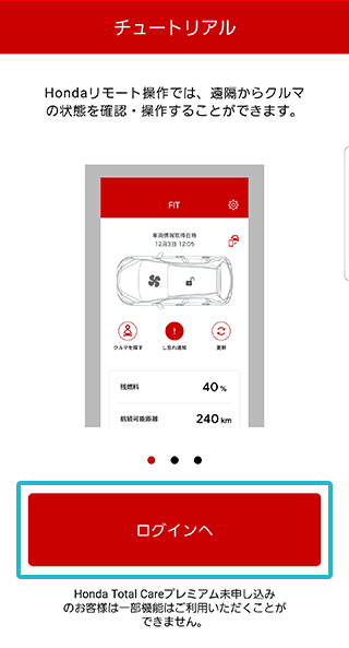 Honda リモート操作アプリを立ち上げ、チュートリアル確認後、「ログインへ」をタップ。