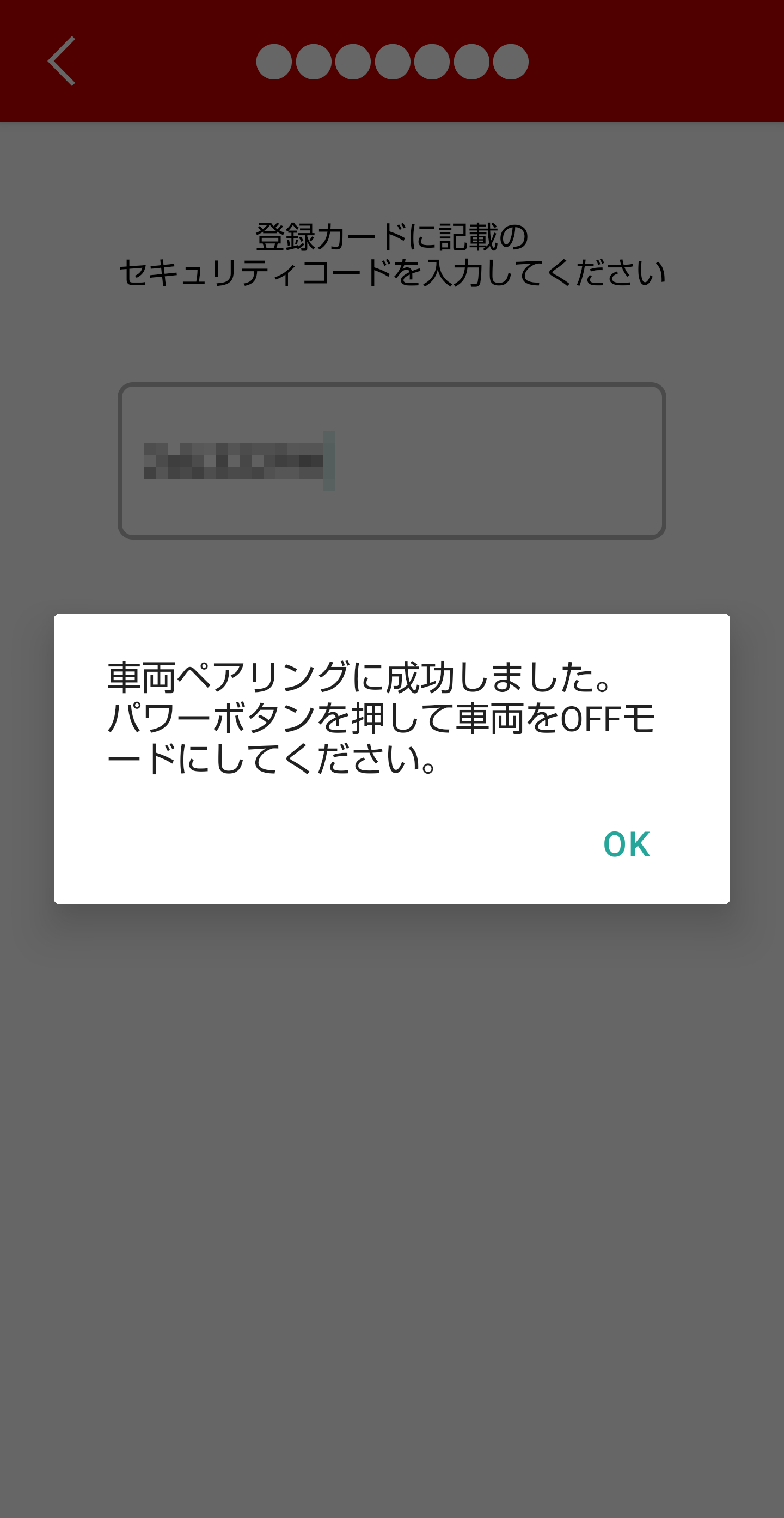 車両ペアリング成功後、表示されるポップアップの「OK」をタップ、POWERスイッチまたはENGINE START/STOPスイッチを押して車両をOFFモードにする。