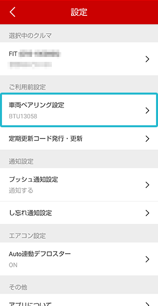 1.TOP画面の右下の「設定」をタップし、設定画面から「車両ペアリング設定」をタップ。