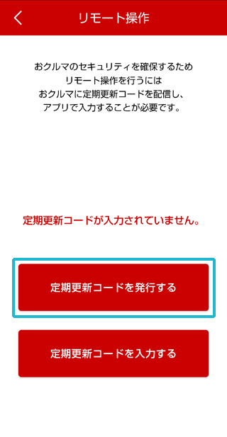 Honda リモート操作アプリの定期更新コードのお知らせ画面より、「定期更新コードを発行する」ボタンをタップ。