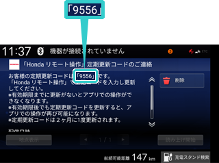 不正利用防止のため、Honda CONNECTディスプレーに表示される定期更新コードをHonda リモート操作アプリに登録する必要があります。