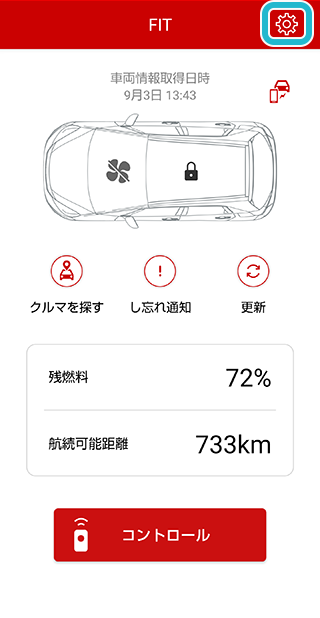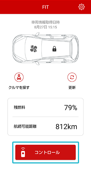 Honda リモート操作アプリを起動し、TOP画面から「コントロール」をタップ。