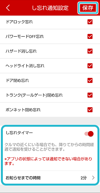 し忘れ通知をしたい情報にチェックをいれます。Bluetoothの接続状態に関わらず、一定の時間が経過したタイミングでお知らせする「し忘れタイマー」の設定もできます。