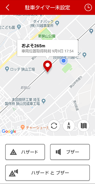 Honda リモート操作アプリを使って、車両の現在の位置を地図上で確認し、ハザードの点滅やブザーを鳴らすことができます。 広い駐車場でクルマが見当たらないときなどに便利です。