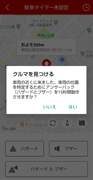 ポップアップの「はい」をタップすると、15秒間ハザードとブザーが鳴動します。※Bluetooth圏外ではハザード&ブザーボタンはグレーアウトし押すことができません。