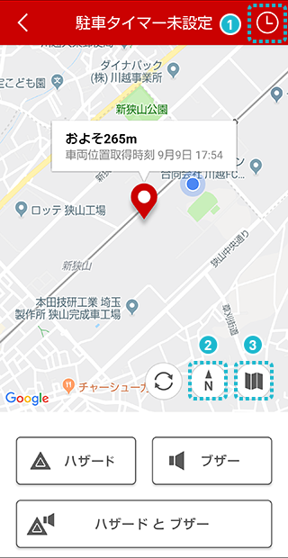 車両の現在位置を地図上で確認し、ハザードの点滅やブザーを鳴らすことで、