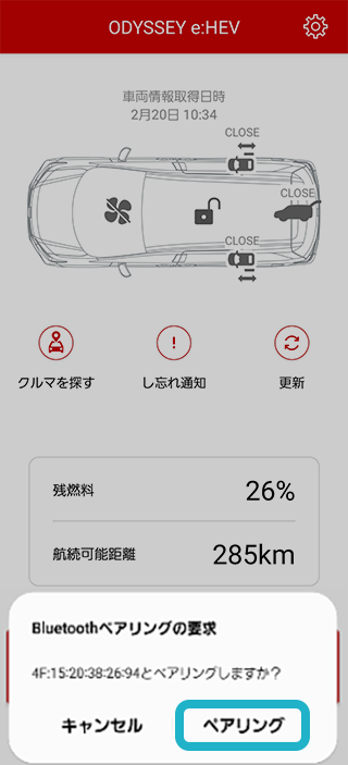 Honda リモート操作アプリをダウンロードしたスマートフォンと車両でペアリング設定を行います。