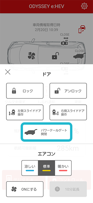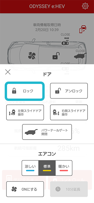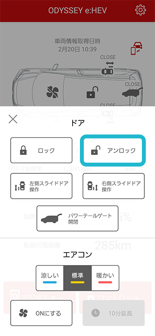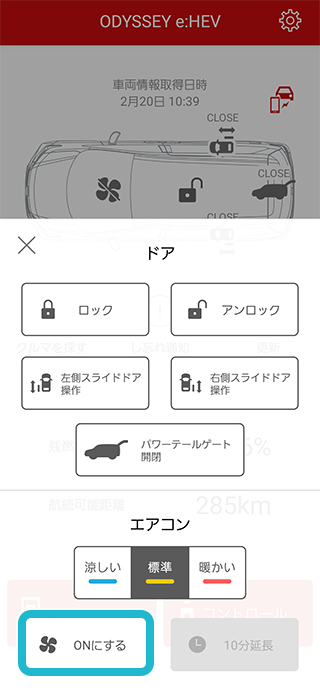 「ONにする」ボタンをタップするとエンジンが始動し、1度の操作で10分間エアコンが作動します。