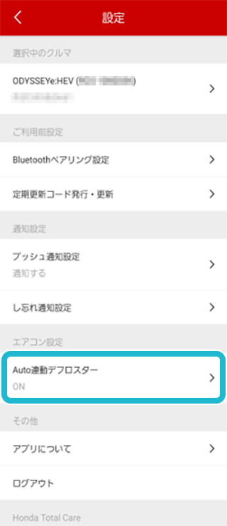 Auto連動デフロスターのON/OFFを変更できます。TOP画面右上「設定」をタップ。