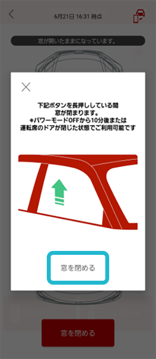 窓を閉めるときはボタンを長押ししてください。※テールゲート閉め忘れは、一部グレードにのみ対応しております。 ※Honda リモート操作でのエアコン稼働中は、し忘れ画面でのドアロック操作ができません。 ※窓閉め忘れは、Bluetooth接続圏外のときは操作できません。 ※パワーモードがONの場合、窓閉め操作は作動しません。 ※車内にHonda スマートキーがあると操作できません。