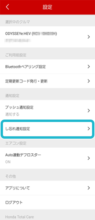 TOP画面右上「設定」をタップし、設定画面から「し忘れ通知設定」をタップ。