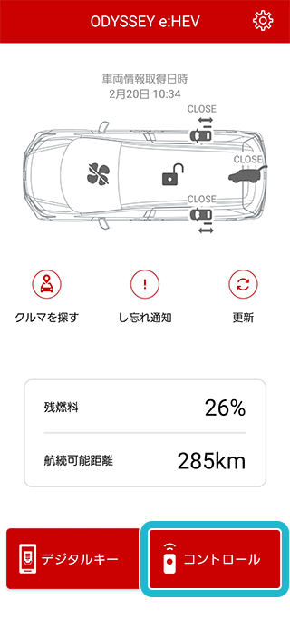 Honda リモート操作アプリを起動し、TOP画面から「コントロール」をタップ。