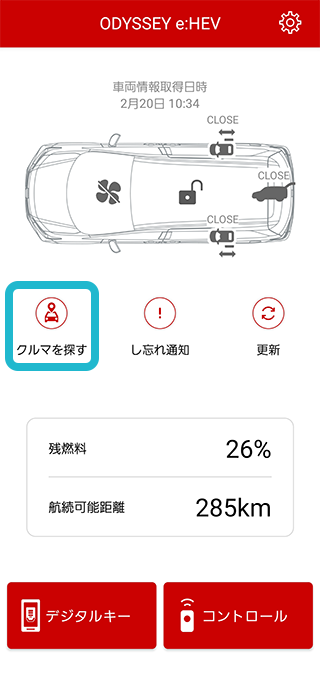広い駐車場でもクルマを見つけやすくなります。Honda リモート操作アプリを起動し、「クルマを探す」をタップ。