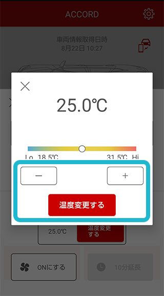 温度調節バーを左右に動かす、または“ー”、“+”をタップし、設定温度を変更し、「温度変更する」をタップ。