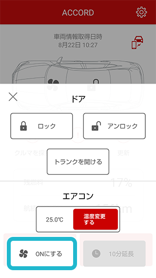 - ※1度のドライブで10分×2回(最大20分/延長操作も含む)エアコン操作が可能です。