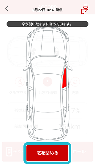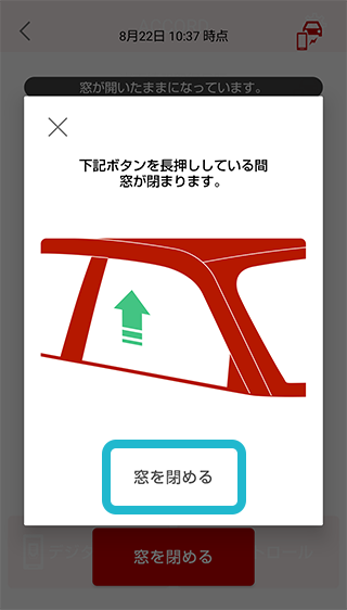 窓を閉めるときはボタンを長押ししてください。※Honda リモート操作でのエアコン稼働中は、し忘れ画面でのドアロック操作ができません。 ※窓閉め忘れは、Bluetooth接続圏外のときは操作できません。 ※パワーモードがONの場合、窓閉め操作は作動しません。 ※車内にHonda スマートキーがあると操作できません。