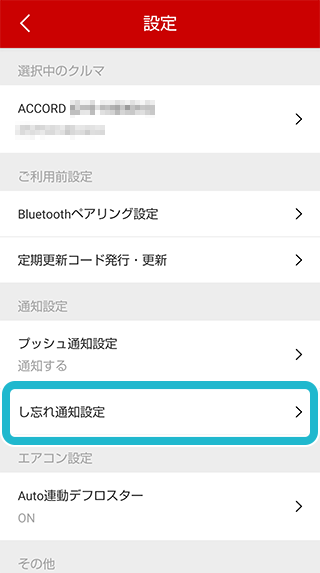 TOP画面右上「設定」をタップし、設定画面から「し忘れ通知設定」をタップ。