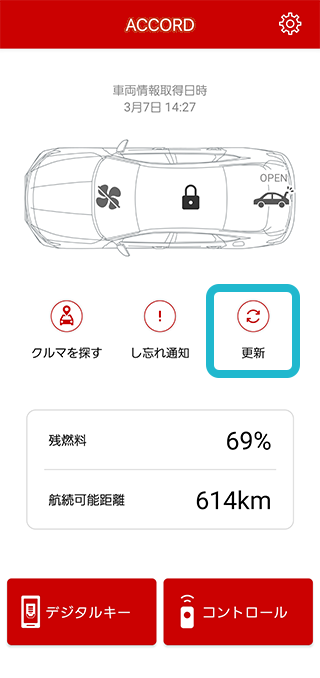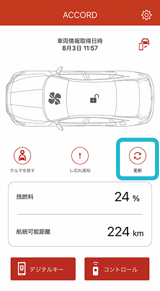 - ※クルマの状態とアプリの表示にアンマッチがある場合、TOP画面の更新ボタンをタップしてください。