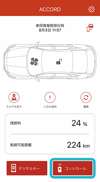 Honda リモート操作アプリを起動し、TOP画面から「コントロール」をタップ。