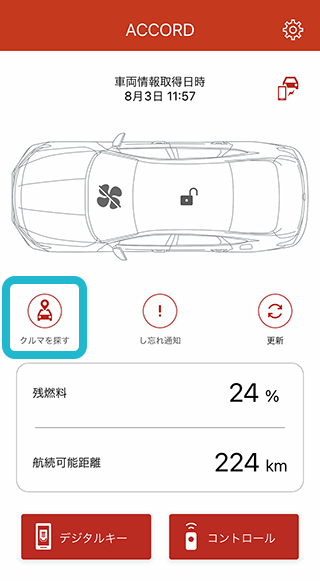 広い駐車場でもクルマを見つけやすくなります。Honda リモート操作アプリを起動し、「クルマを探す」をタップ。