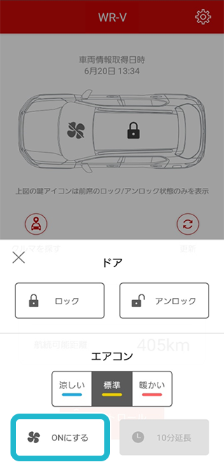 「ONにする」ボタンをタップするとエンジンが始動し、1度の操作で10分間エアコンが作動します。