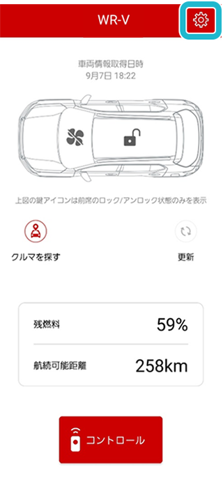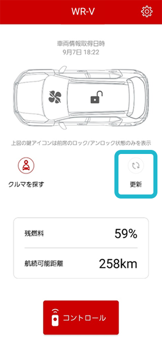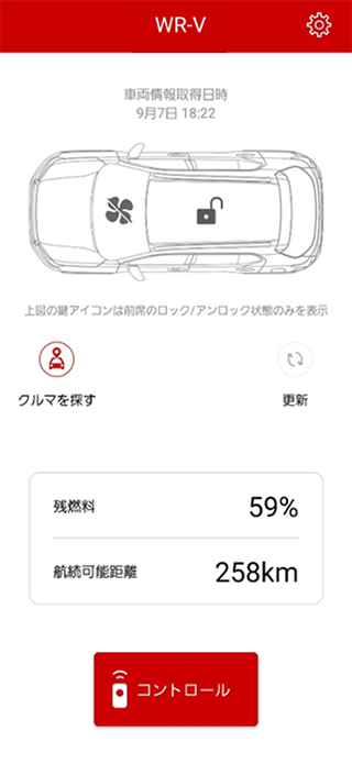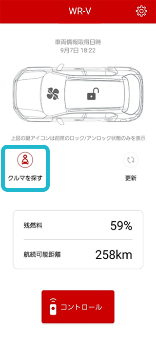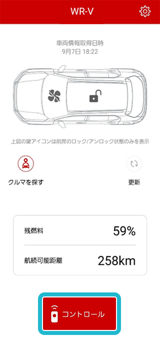 Honda リモート操作アプリを起動し、TOP画面から「コントロール」をタップ。