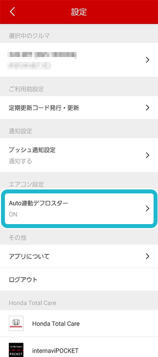 Auto連動デフロスターのON/OFFを変更できます。TOP画面右上「設定」をタップ。