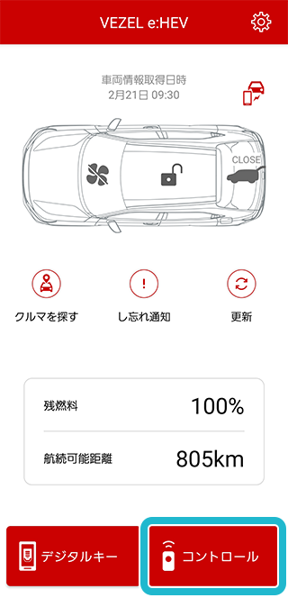 Honda リモート操作アプリを起動し、TOP画面から「コントロール」をタップ。