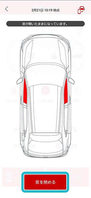 窓を閉めるときはボタンを長押ししてください。※テールゲートを遠隔で操作できるのは、2024年4月~発売モデルのみです。 ※テールゲート、窓閉め忘れは、一部グレードにのみ対応しております。 ※Honda リモート操作でのエアコン稼働中は、し忘れ画面でのドアロック操作ができません。 ※窓閉め忘れは、Bluetooth接続圏外のときは操作できません。 ※パワーモードがONの場合、窓閉め操作は作動しません。 ※車内にHonda スマートキーがあると操作できません。