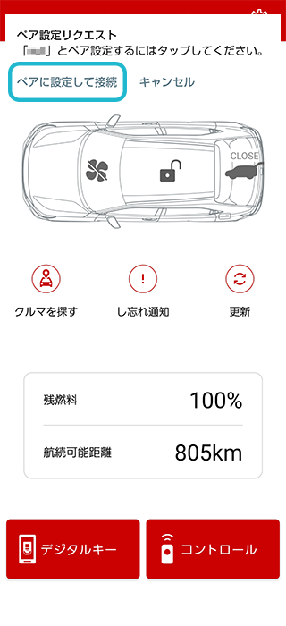 Bluetooth圏内とはTOP画面右上、車両とスマホがつながっている赤いアイコンが表示されている場合はBluetooth圏内となります。