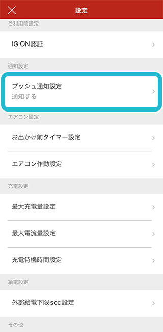 設定メニューより、「プッシュ通知設定」をタップ。
