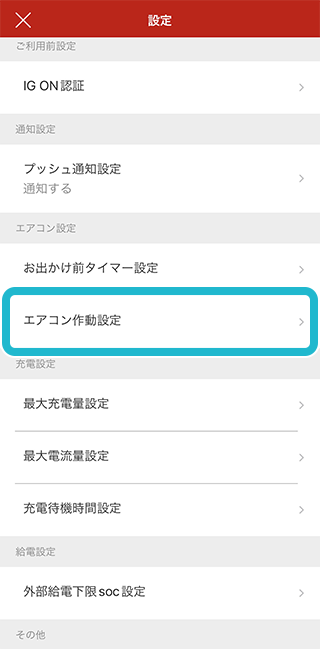 設定画面から「エアコン作動設定」をタップ。