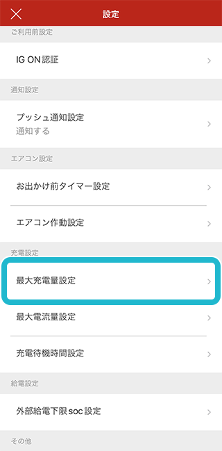 設定画面から「最大充電量設定」をタップ。