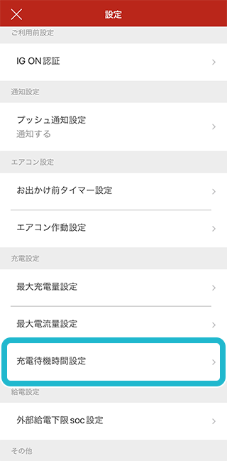 時間帯で電気代が変わるプランをご契約されている場合などにお使いいただけます。設定画面で『充電待機時間設定』をタップ。