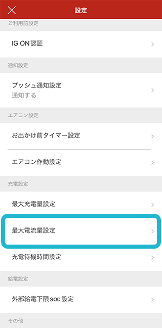 設定画面で『最大電流量設定』をタップ。