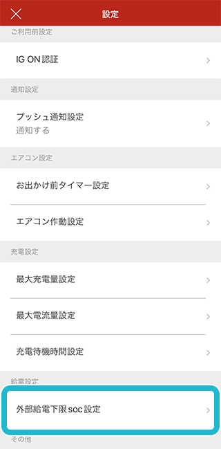設定画面で「外部給電下限SOC設定」をタップ。