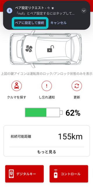 Bluetooth圏内とはTOP画面右上、車両とスマホがつながっている赤いアイコンが表示されている場合はBluetooth圏内となります。
