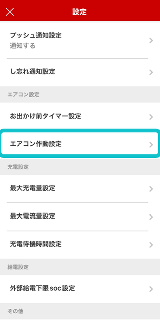 設定画面から「エアコン作動設定」をタップ。