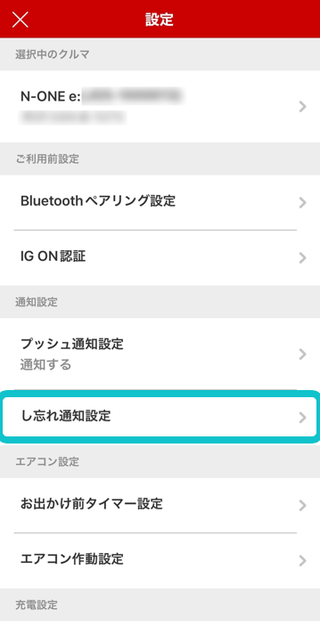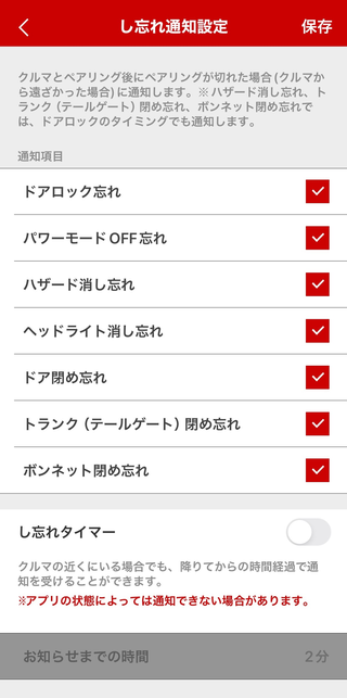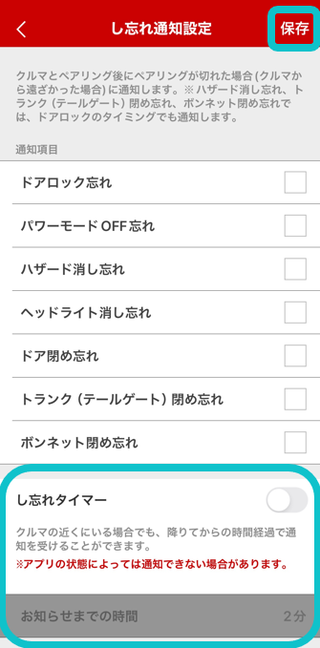 し忘れ通知をしたい情報にチェックをいれます。Bluetoothの接続状態に関わらず、一定の時間が経過したタイミングでお知らせする「し忘れタイマー」の設定もできます。