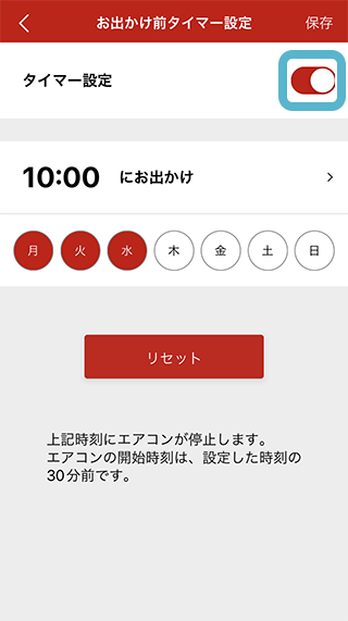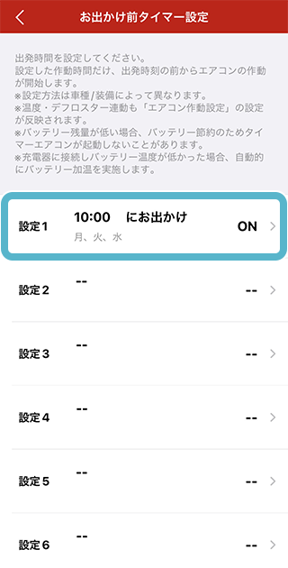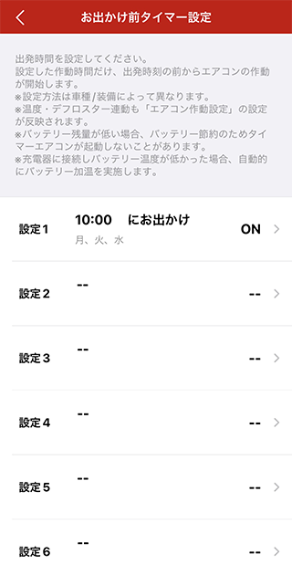 「お出かけ前タイマー設定」画面から、ONとなっている設定を確認できます。