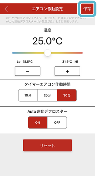 温度設定やタイマーエアコン、Auto連動デフロスターの詳細を設定できます。