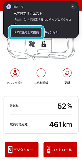 Bluetooth圏内とはTOP画面右上、車両とスマホがつながっている赤いアイコンが表示されている場合はBluetooth圏内となります。